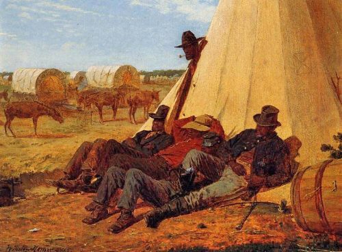 During the Civil War African Americans served as military teamsters for the large wagon trains of military supplies. Winslow Homer recorded some of the Union teamsters in an oil painting called The Bright Side shown below.