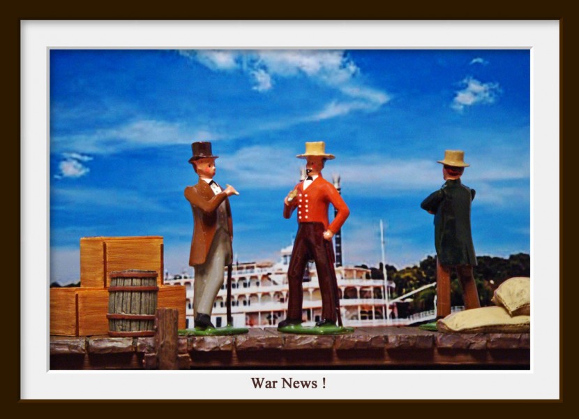 Two planters in Charleston for the purpose of visiting the Cotton Exchange discuss the latest war news. They are concerned about the impact it will have on their crops and business dealings with textile factories in the north.