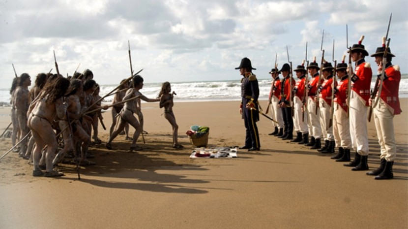 Darwin, Fitzroy, Royal Marines & FuegiansRandy Bond - 29Jun10 7:11PMI would like to see Bill do some figures based on this still from the 2009 film Creation about Charles Darwin. Here we see Capt. Robert Fitzroy and Royal Marines of the H.M.S. Beagle confronting the natives (Fuegians) on the island of Tierra del Fuego. It would make a nice companion to Set 402 Origin of the Species and go well with the other historic events he has already captured in tin and glossy paint.