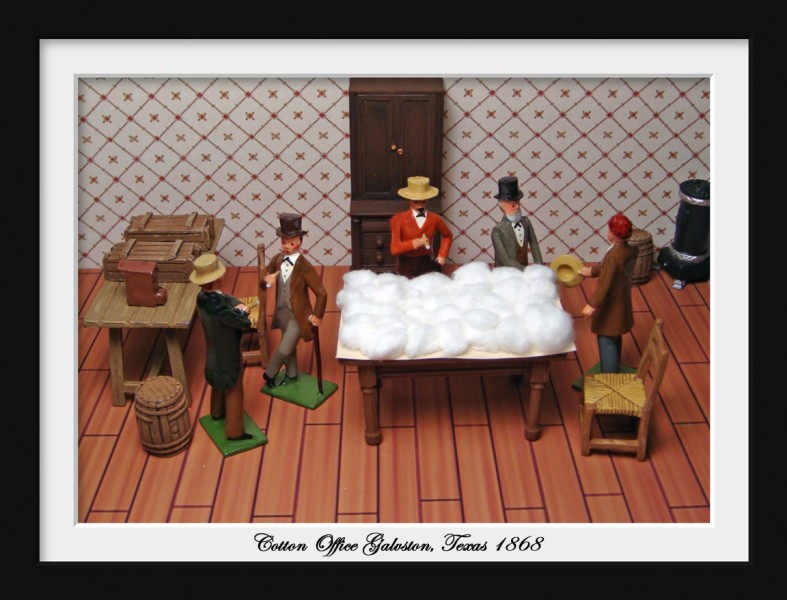 "Cotton Office, Galveston 1868"Randy Bond - 1Jul11 11:21AMIn the 19th C cotton was a global commodity economically connecting nations and people all over the world. Cotton and the Industrial Revolution whose textile mills it fed were a major source of the expansion of capital in these years. During this time period it was America's most important export. Once cotton left the plantations where it was grown (e.g. the American South, India, Egypt, Brazil, etc.) it entered the world of the cotton brokers, merchants, buyers and speculators. Below is a scene of one of the cotton offices found in the American South: this one in Galveston, Texas where a group of businessmen have gathered to examine samples of the crop grown in Texas during Reconstruction after the Civil War. An office such as this would include not only local individuals but representatives from mills in Massachusetts or factories in England.