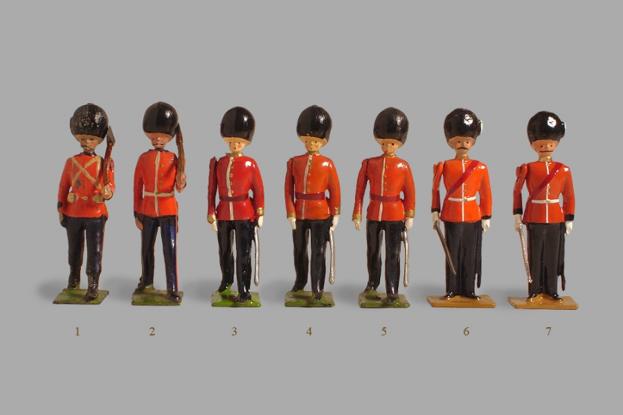 As can be seen (although the internet is the worst place to judge colors), Britains red changed slightly over the years with one major anomaly (#3) in the post wars years. Which one to choose for our goods? In the first years of our production I made and attempt to match as closely as possible the colors of the between-the-wars briatins paint style (#2). The faces were ruddy to the point of being grey and the scarlet was bright orange. At one point we even used testor's italian red straight from the bottle since it was a close match (#6). In my showroom I have shelves of old Britains (mostly post war) adjacent to shelves of our own goods. At some point in the early 90's I noticed that the mass of our figures had a consistently brighter look to the red than the mass of the britains figures and decided that our red needed to be toned down. At the same time I finally realized that the grey skin color, while adequate on brightly colored figures, did not give the spark of liveliness to bland uniforms that the Britians post-war flesh did. The 2 changes resulted in the #7 colors we use today.