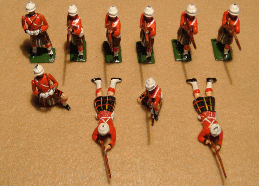 Wm. Hocker Redcoats Under Fire! - 9Apr10 5:20PMIn the last week I have received two voices of concern, one from each side of the atlantic, about the red that we use for our scarlet tunics. In both cases the feeling was that the red was too orange and too dull. Since our goal is to produce figures that match old hollow cast Britains, I present here my basis for the color. Represented in the accompanying photo are: