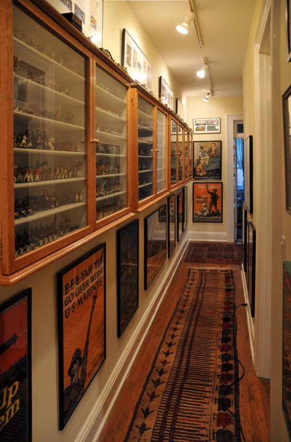 All of the cabinets were made by a cabinet maker on Capitol Hill in Washington, Peter Hackett. The spaces below the cabinets in "The Hocker Room" were specially designed to hold Bill's boxes -- except for the Zulu War, Diamond Jubilee and Buffalo Bill boxes -- which, alas, reside in a closet. I have a set of drawings for the hallway cabinets which I am happy to share. The cabinets in the basement level are of a slightly different style, with glass shelves. If anyone is interested in seeing some photos of these, I will post them. Keen-eyed observers will have noted that all the cabinet doors are oak -- reportedly the equivalent of toy soldier kryptonite. Perhaps, but these doors are all polyurethaned, on all surfaces, and I have never had any lead rot. The only thing I would change were I to do The Hocker Room again would be to use glass for shelving and figure out some better form of lighting.