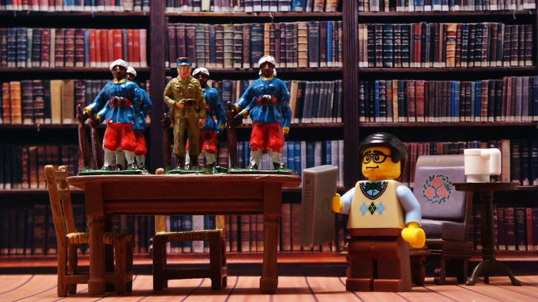 The Limited Edition Lego figure of a professor/librarian was a recent gift. The soldiers on the table are from my collection that I gathered in the 1950s-early 60s. They are French North African troops and their officer.